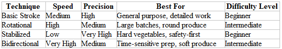 ⦁ Rotate and Repeat: After each stroke, rotate the produce slightly to tackle a new section.