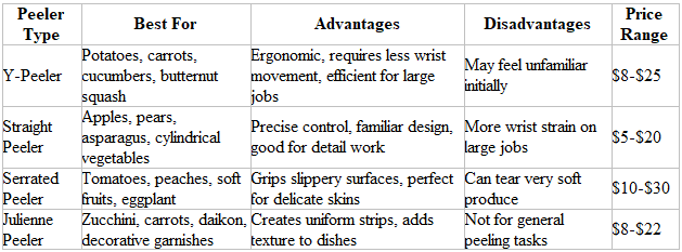 1. Y-Peeler (Swiss Peeler) The Y-shaped peeler features a horizontal blade perpendicular to the handle. This design allows for smooth, controlled strokes that follow the natural contours of produce.